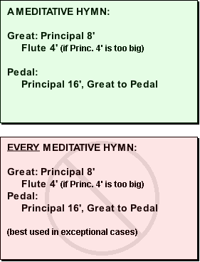 Any such replacement of a principal stop for congregational accompaniment should be used only if there is still enough strength in the combination to lead the congregation. This should be considered an exceptional circumstance, and then only for the more meditative hymns.
