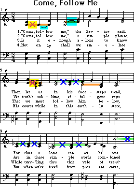 Soprano is queen in hymn playing. The integrity of the soprano line must be preserved. Therefore, if repeated notes occur in the soprano, they must be repeated. Never tie two repeated notes in the soprano line. (See the blue “X” spots.)