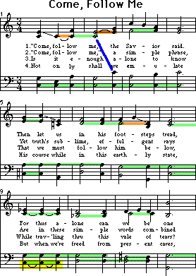 Only one such case occurs in this hymn (see blue line). You can choose either to tie or to break based on the desired effect. For verses 1 or 2, breaking creates a “breath” that could help clarify the text. For verses 3 or 4, tying will contribute towards a sense of continuity. Of course, the repeated notes and common tones in the other parts, and their position relative to the meter must also be considered. (Meter will be discussed on the next screen.)