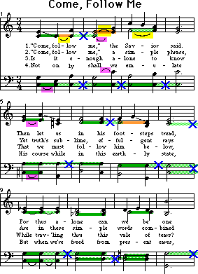 In modern notation, THE BAR LINE always precedes the first and strongest beat. Normally, avoid anything that would weaken the first beat, such as tying into it from the preceding measure. (See the blue “X” spots.)
