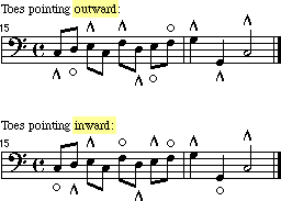It is usually best to reach a key in the extreme upper or lower ranges with the toe rather than the heel. Also, when faced with a decision between “toe then heel” on the same foot or “heel then toe,” and if other factors are equal, choose the option that will allow the toes to remain pointed out. This reduces motion.